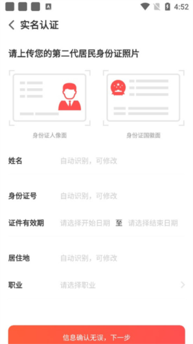4、上传身份证照片让App自动识别信息,核对无误后点击确认。