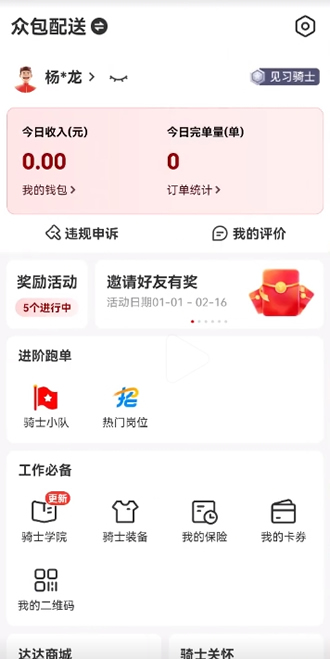 在“我的”页面中,查找并点击**“骑士招募”**选项,进入骑手众包的注册和报名页面。