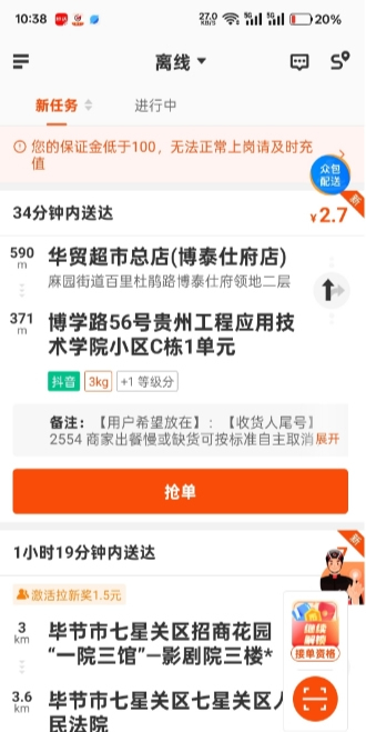 接单与抢单:配送员可以查看系统派发的订单或手动抢夺附近可配送的任务。